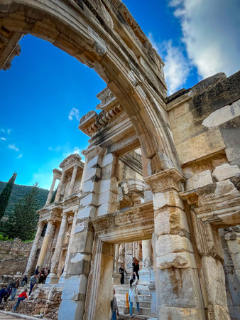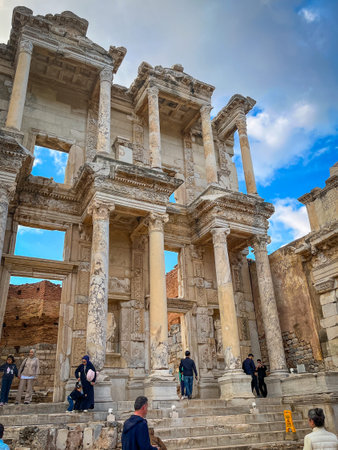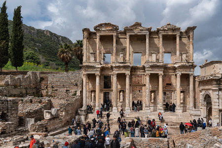 Ephesus, Turkey - February 04, 2025: Tourists explore the magnificent ancient Celsus Library ruins under a cloudy sky, with lush mountains in the background