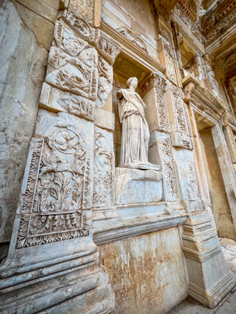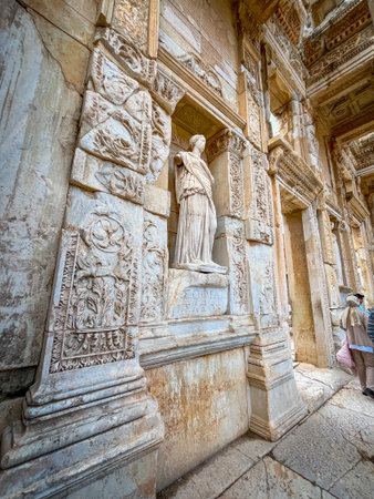 Ornate stone relief panels depicting figures and scrolls surround a central niche with a poised female statue on the weathered facade of ancient Ephesus. Subtle shadows accentuate the intricate textures and classical proportions of Roman design.