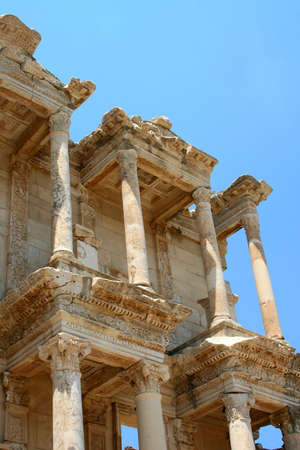 Antiquity greek city - Ephesus. Columns of First Library and blue sky