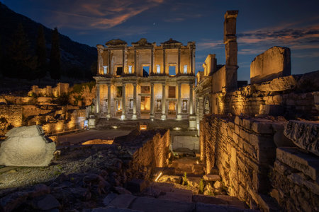 Celsus Library in the ancient city of Ephesus in Izmir, Turkey. Evening lights burned out
