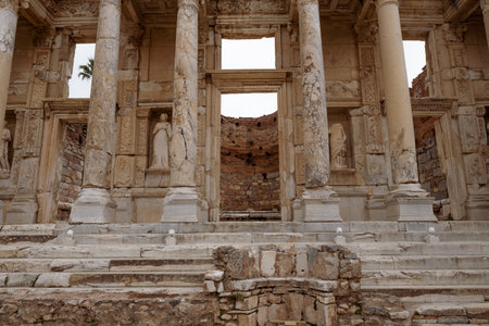 The front facade and courtyard of the Library of Celsus at Ephesus is an ancient Greek and Roman structure. Reconstructed by archaeologists from old stones, it is near the city of Izmir in Turkey.