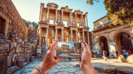 Tourist hands holding smartphone capturing ancient Roman library ruins at Ephesus with classical columns and archaeological stone architecture.
