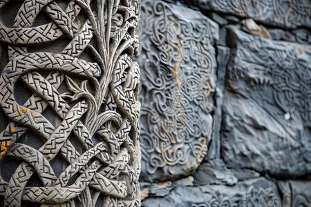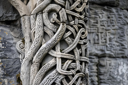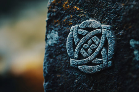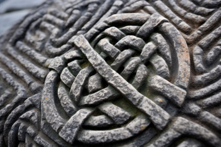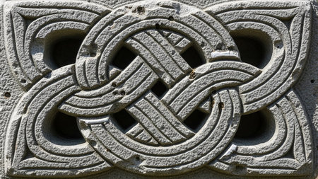 A close-up view of a weathered stone carving showcasing a mesmerizing knot design. The artistic detail speaks of a rich history, likely found in a tranquil historical site or ruins.