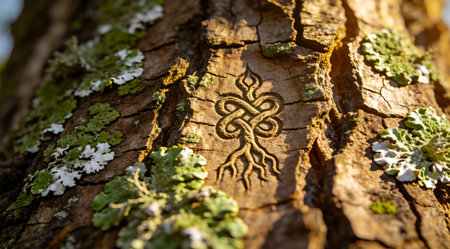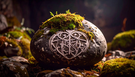 Discover a beautifully detailed stone symbol adorned with moss, highlighting nature's reclaiming beauty and ancient craftsmanship. Perfect for art and history themes.