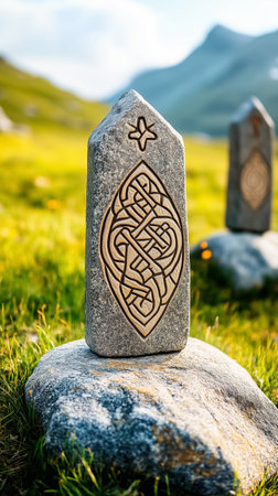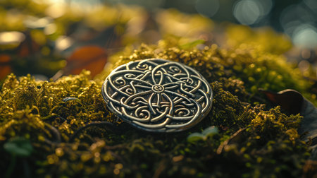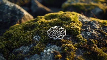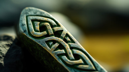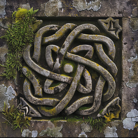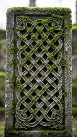 A beautiful stone symbol featuring an intricate Celtic design. Covered in moss, this ancient motif showcases craftsmanship and cultural heritage, blending nature with artistry.