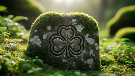 Moss covered stone, carved shamrock symbol, forest floor, nature, Irish symbol