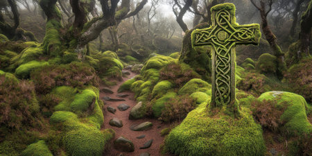 Ancient moss-covered stone. Intricate celtic knot patterns. Verdant forest monument. Historical stone carving. Irish heritage.