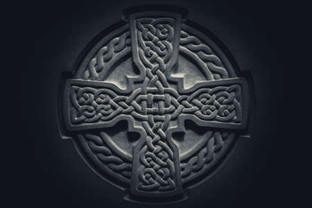 Historic celtic knot carving. Moss covering ancient stone texture. Traditional irish artwork detail. Archaeology background.
