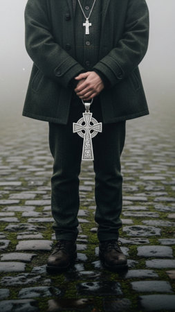 A tall, vertical 9:16 full-body editorial shot of a figure standing in atmospheric Irish mist on old