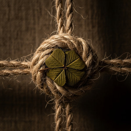 Hero detail shot. Extreme macro close-up of a perfectly centered, symmetrical knot made of rough jut