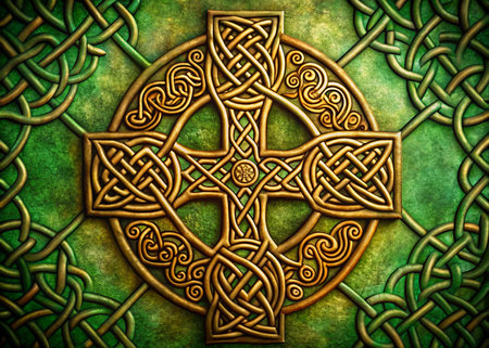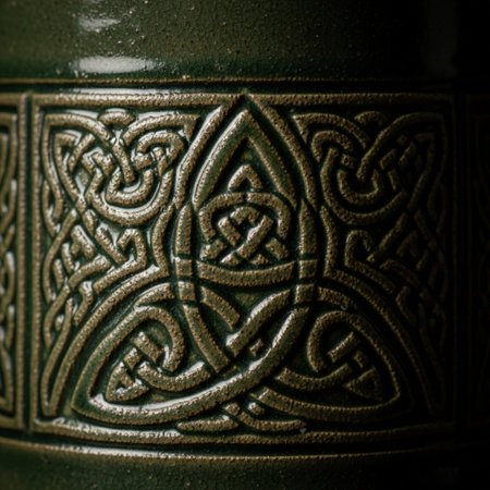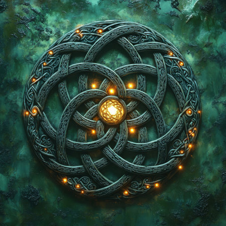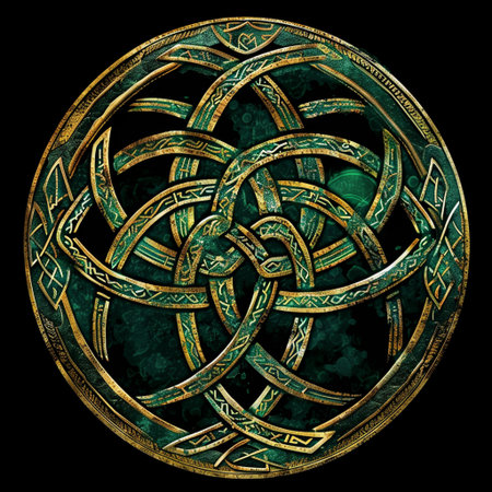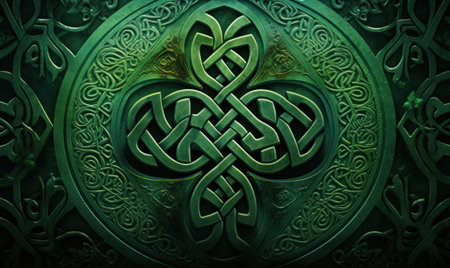 A detailed Celtic pattern rosette displays interlacing loops and a central sphere, highlighted in rich green shades. This design represents cultural heritage and artistry, adding a timeless elegance.
