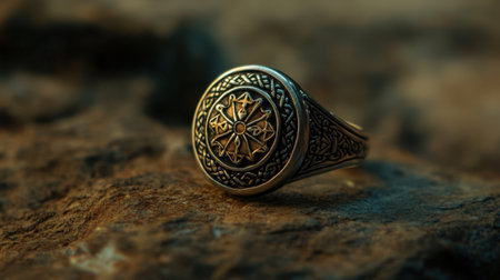A stunning antique silver ring featuring intricate designs rests on a rugged stone surface, highlighting the beauty of craftsmanship and timeless elegance.