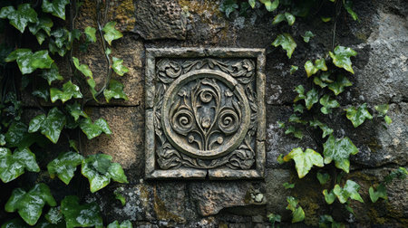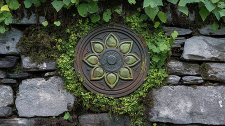 This captivating image features a vintage stone wall adorned with an ornate circular design, encircled by vibrant green moss and delicate climbing plants.