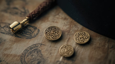 This exquisite image showcases vintage golden seals and an elegant stamp, all beautifully arranged on an antique map backdrop, highlighting intricate craftsmanship.