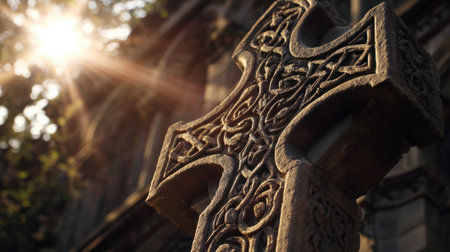 A closeup of a stone cross, its intricate carvings illuminated by a ray of sunlight, evoking a sense of divine presence and guidance