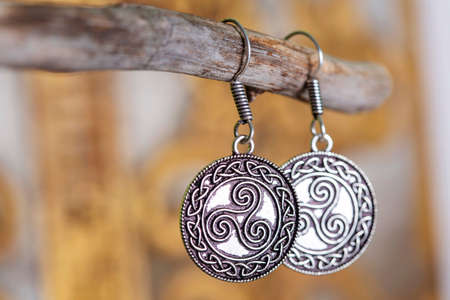 carved wooden ornament on the wall of the house, close-up, ancient ornament pattern, celtic vikings knots ornament on leather, handmade