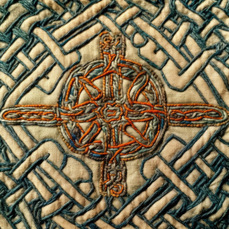 Fabric with a pattern of the Celtic cross. Close-up, ancient ornament pattern, handmade, embroidered on fabric