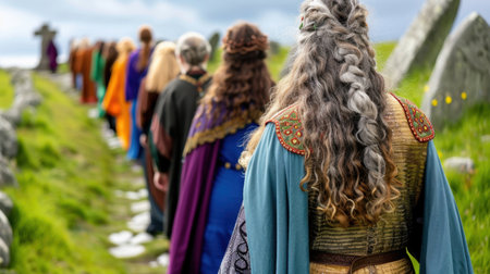 A captivating scene of a diverse group of mystical figures adorned in colorful garments, walking in unison along a tranquil path in nature, evoking spirituality and tradition.