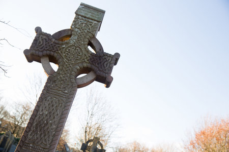 Beautifully engraved celtic cross stands among autumn leaves in a serene graveyard setting