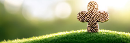 Celtic cross placed on lush green grass surrounded by soft sunlight. Tranquil natural setting evokes spirituality and reflection. Concept of faith, nature, outdoor events.