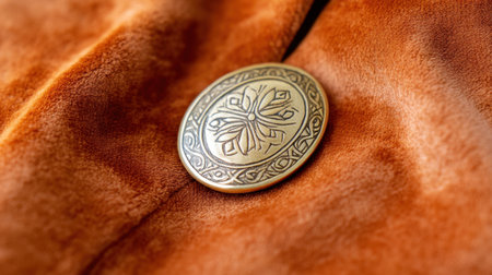 This close-up image features a vintage ornate button on a soft velvet fabric in a rich terracotta hue, showcasing intricate design and elegance.