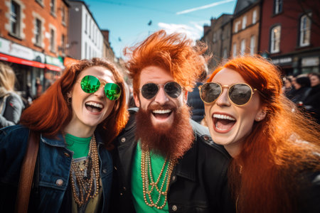 Beautiful young cheerful friends wearing green clothes and accessories participating in traditional Saint Patrick's Day parade in Irish town. Generative AI.