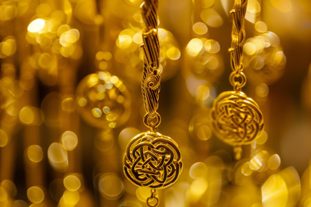 Close-up of ornate, golden pendant light fixtures suspended against a soft, bokeh-filled backdrop. The intricate designs and warm, golden hue create a luxurious and inviting ambiance.