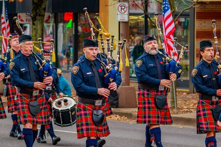 Portland, Oregon, USA - November 11, 2016: Portland Police Highland Guard Pipe Band in the annual Ross Hollywood Chapel Veterans Day Parade, in northeast Portland.