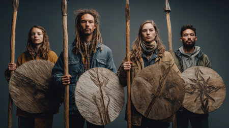 Group of four diverse young people holding traditional wooden shields and spears in warrior costume, medieval historical reenactment concept.