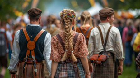 Oktoberfest. People are dressed in traditional Bavarian clothing, including lederhosen and dirndls.