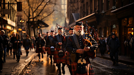 Men in traditional Scottish kilts, led by bagpipes, marching energetically down a city street