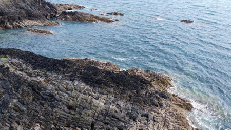 Sea landscape, drone view ocean coast, rocks and ocean in vintage tones.