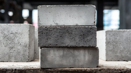 Neatly organized stack of cement blocks on a dusty site, symbolizing preparation for construction, building materials, and industrial work