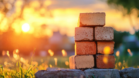 A serene sunset casts a warm glow over a stack of bricks in a grassy field, highlighting the natural beauty and textures of the bricks against the vibrant sky.