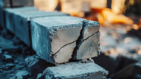 This image showcases a close-up view of cracked concrete blocks at a construction site, highlighting the weathered textures and raw materials involved in building projects.