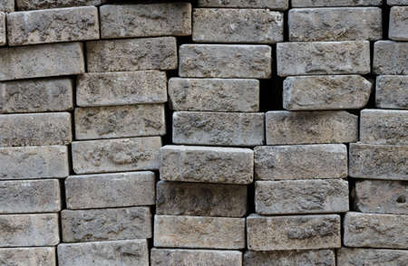 Gray concrete are neatly stacked in a pile, slender rows of bricks, material for building a house