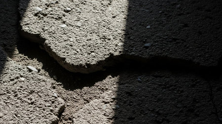 Close-up showing close-up of cracked concrete surface with rough texture and dramatic shadows highlighting the deep...