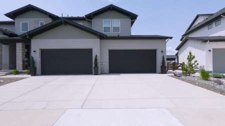 A duplex-style suburban home features neutral exterior tones and a large concrete driveway. Captured on a sunny day, the image shows the quiet residential environment.