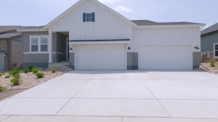 A modern home with white siding and a large double garage sits on a wide concrete driveway in Castle Rock, Colorado. The yard is minimal with some green landscaping.