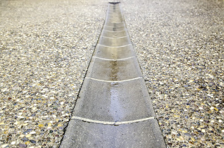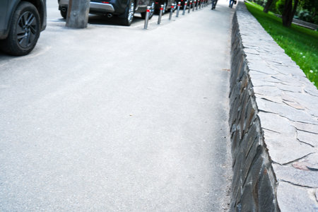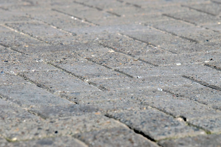 Narrow view of a concrete tile in the blurred sidewalk. Cement block on a pedestrian crossing. Textured abstract background bokeh.