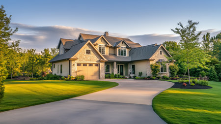 craftsman home exterior with stone path and wooden garage doors, created with generative ai