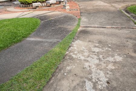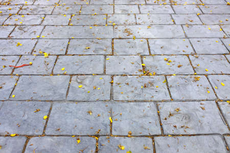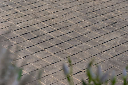 Photo of the site from the old paving slab with small defects and cracks, leaving in perspective. Street coverage of pedestrian areas and paths in parks in daylight outdoors