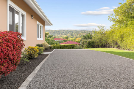 A sleek, contemporary residence features a distinctive asphalt pathway, illuminated by warm sunset rays, creating an inviting and stylish outdoor ambiance.