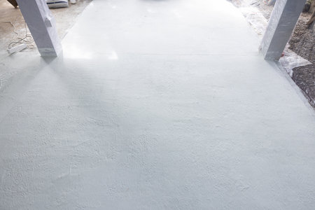 Terrazzo floor construction work in perspective view. Small gravel mixed with white mortar cement pouring for topping on concrete floor. Interior decoration.