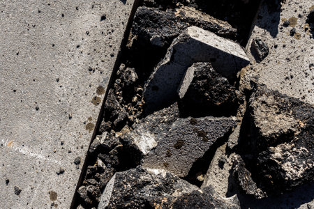 Repaving work. Asphalt pieces, pieces of broken asphalt, repairs, construction work