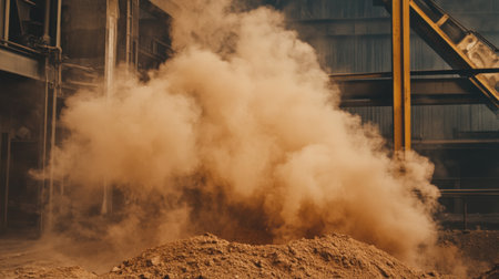 A dramatic dust cloud rises from a pile of earthy material in an industrial warehouse, illustrating the transformation and disturbance of the environment.