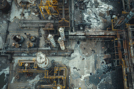 A view of a large industrial plant with a lot of pipes and tanks. The image has a sense of industrialization and a feeling of being in a cold, harsh environment