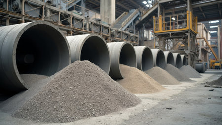 Industrial concrete plant with rotating drums machinery and conveyor belts in operation