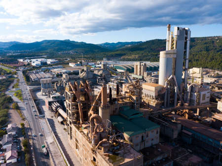 Aerial view of cement factory tower with high concrete plant structure at industrial production area at sunset. Manufacturing and global industry concept.