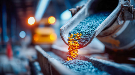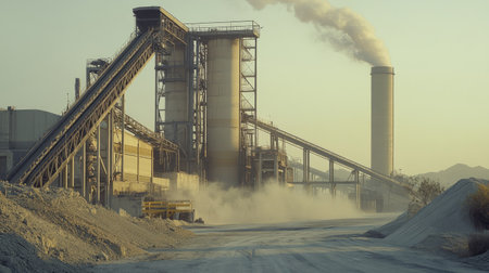 An industrial site features a conveyor belt transporting materials against a backdrop of dust and large machinery under bright daylight, emphasizing activity and efficiency in manufacturing.